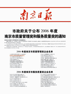 我公司榮獲由南京市人民政府頒發(fā)的“2006年南京市質(zhì)量管理獎(jiǎng)”。該獎(jiǎng)項(xiàng)是對(duì)卓越績(jī)效的評(píng)價(jià)和認(rèn)可,主要圍繞企業(yè)在質(zhì)量管理方面的一系列工作做出測(cè)評(píng),
