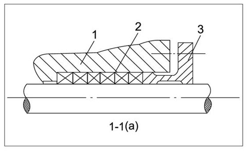 常用填料密封結(jié)構(gòu)如圖1-1(a)所示,填料密封由填料2裝于填料函1內(nèi),通過(guò)填料壓蓋3將填料壓緊在軸的表面。由于軸表面總有些粗糙,其與填料只能是部分貼合,而部分未接觸,此就形成無(wú)數(shù)個(gè)迷宮。當(dāng)帶壓介質(zhì)通過(guò)軸表面時(shí),介質(zhì)被多次節(jié)流,憑借這“迷宮效應(yīng)”而達(dá)到密封。填料與軸表面的貼合、摩擦,也類似滑動(dòng)軸承,固應(yīng)有足夠的液體進(jìn)行潤(rùn)滑,以保證密封有一定的壽命,即所謂的“軸承效應(yīng)”。由此可見(jiàn)良好的填料密封,即是迷宮效應(yīng)和軸承效應(yīng)的綜合。